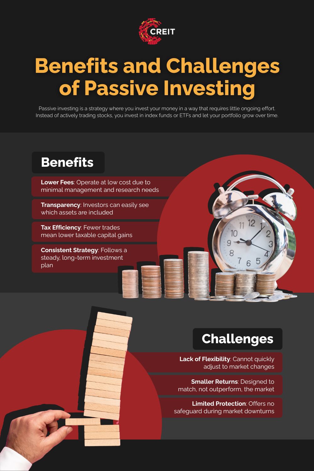 Passive investing offers several advantages, but it also comes with its own set of challenges. Here are some key benefits and challenges to consider: