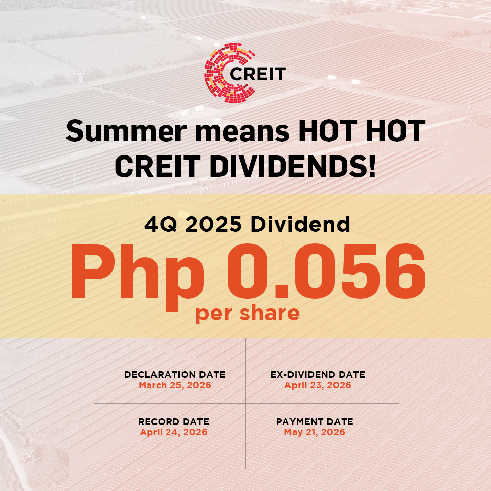 “As CREIT reaches its fourth year, we are proud to declare our highest dividend in a single quarter and total annual dividend to-date. With the significant growth of its sponsor, Citicore Renewables, shareholders can expect CREIT to mirror its trajectory moving forward. As CREC grows, CREIT will have a clear pathway for infusions which will drive dividends up each quarter,” said President and Chief Executive Officer Oliver Y. Tan.